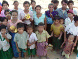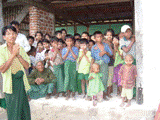 乾燥地帯にあるこの村では農作物もあまり育たなかった上に、農地を失い、生活ができなくなってしまったのです。何とかこの村でやりたい、そう願って残ったのがこの50世帯でした。坂道をトラックが登らないため、建物(ここもみんなが集まるところは例外なくお寺でした)から離れたところで車を止めました。車から降りたととたんに、建物から子ども達の歓迎の声が聞こえます。「こんにちは、セアロ(老師)、みなさん。ようこそお越しくださいました!」
