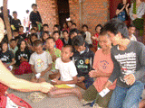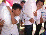 そして、ダイレクトアクション参加者が、パームトゥリーの子ども達と半日かけてバスケットに仕分けし詰めた物資を、一人ひとり手渡しました。子ども達も、重たいお米を率先して運び、村の人々に配ります。数ヶ月前まで、お米を担ぐことなど全くできなかった子ども達ですが、今男の子達は細い体でも嬉々として段取りよく運んでいます。夏に訪れたとき、ミャンマーの子ども達がどんなに力持ちで、楽しく働いているか、そんな話をしたとき熱心に聞いていた彼らの姿を思い出します。